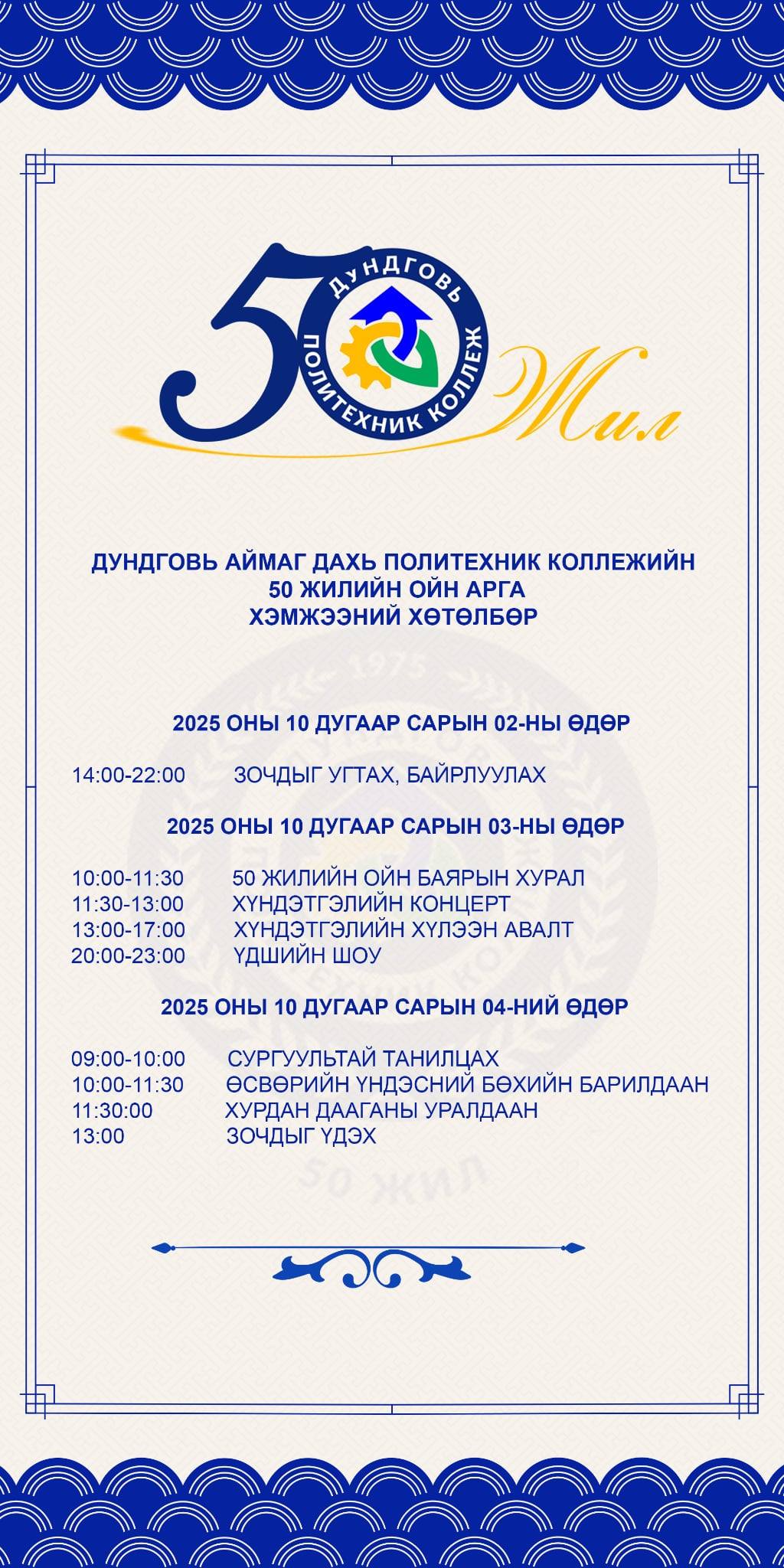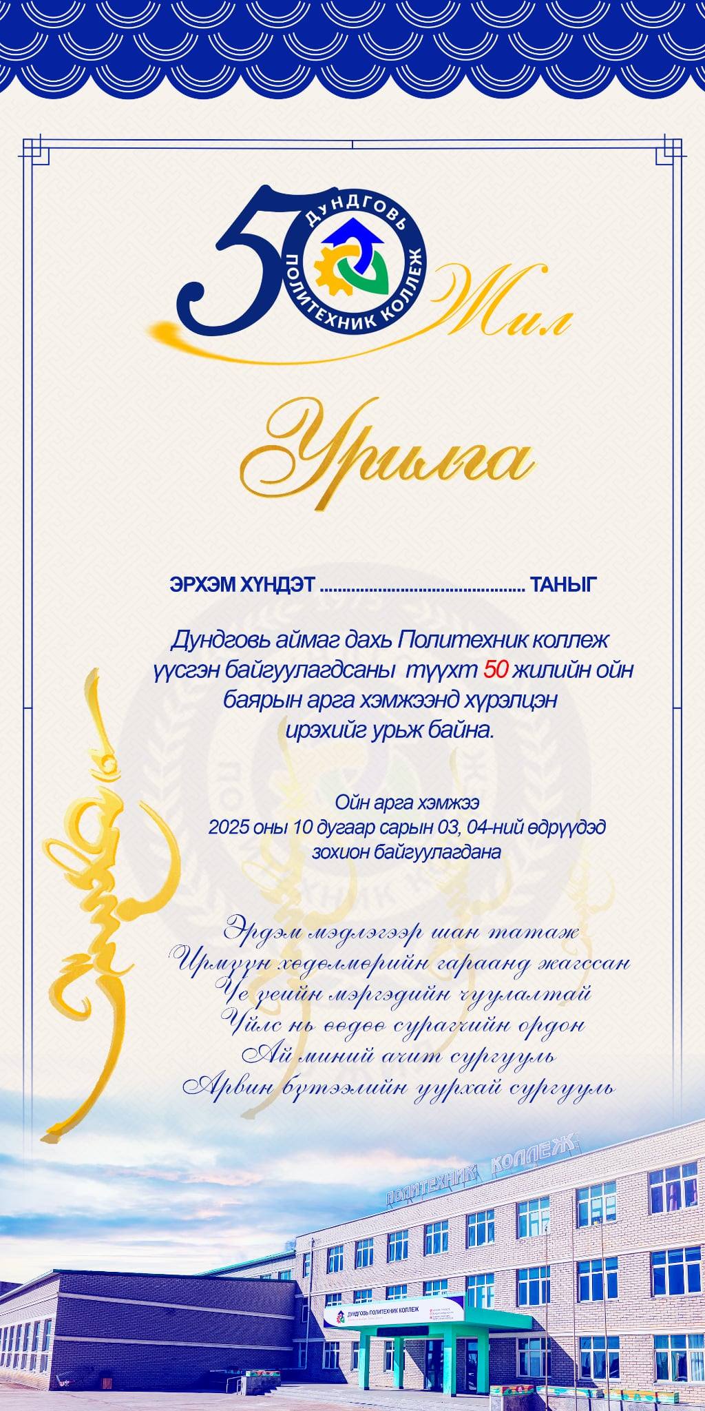 Үе, үеийн эрдэмтэн багш нар, ажилтнууд, төгсөгчид та бүхнийг Дундговь аймаг дахь Политехник Коллеж үүсгэн байгуулагдсаны түүхт жилийн ойн баярын арга хэмжээнд хүрэлцэн ирэхийг урьж байна.