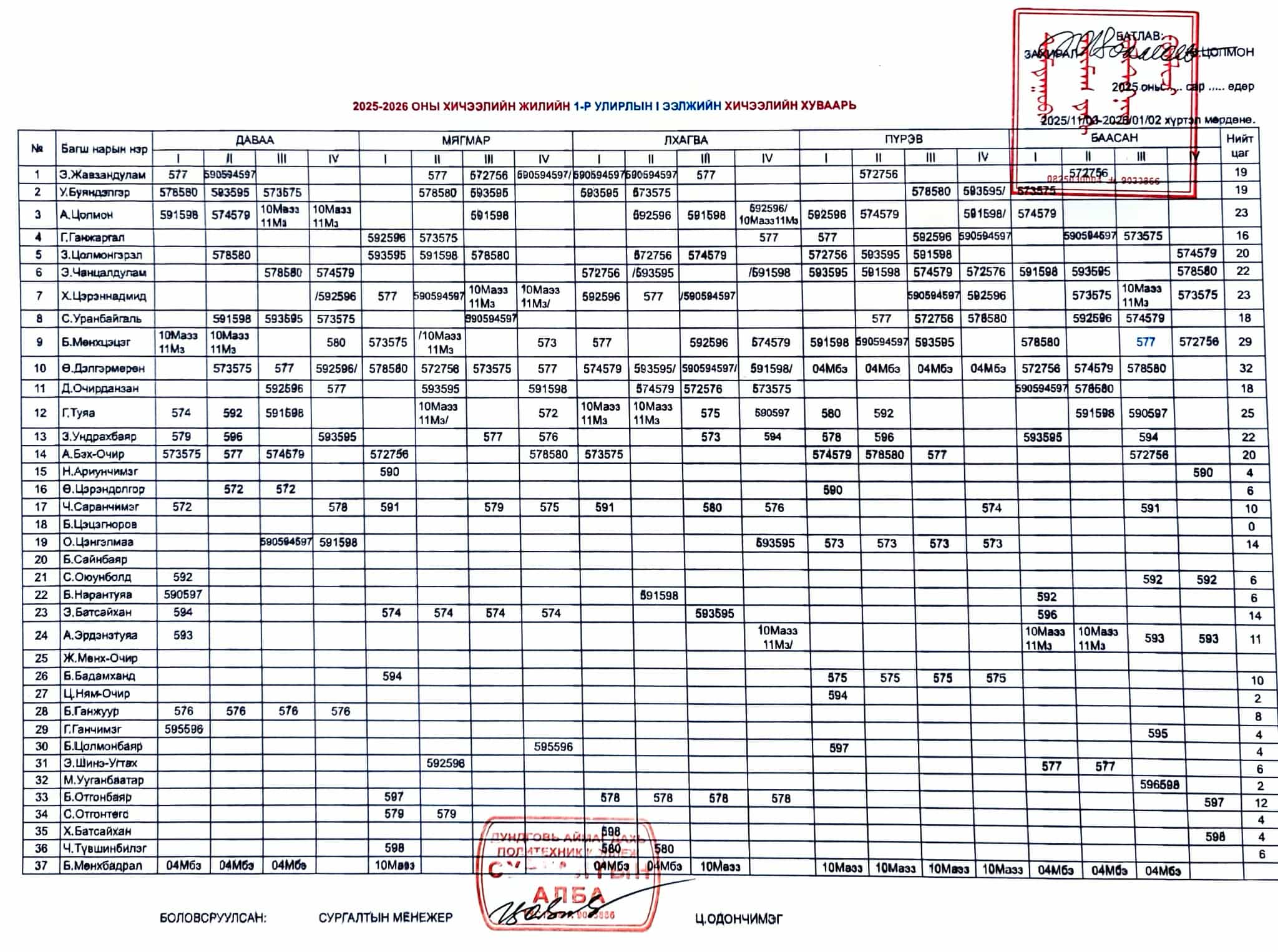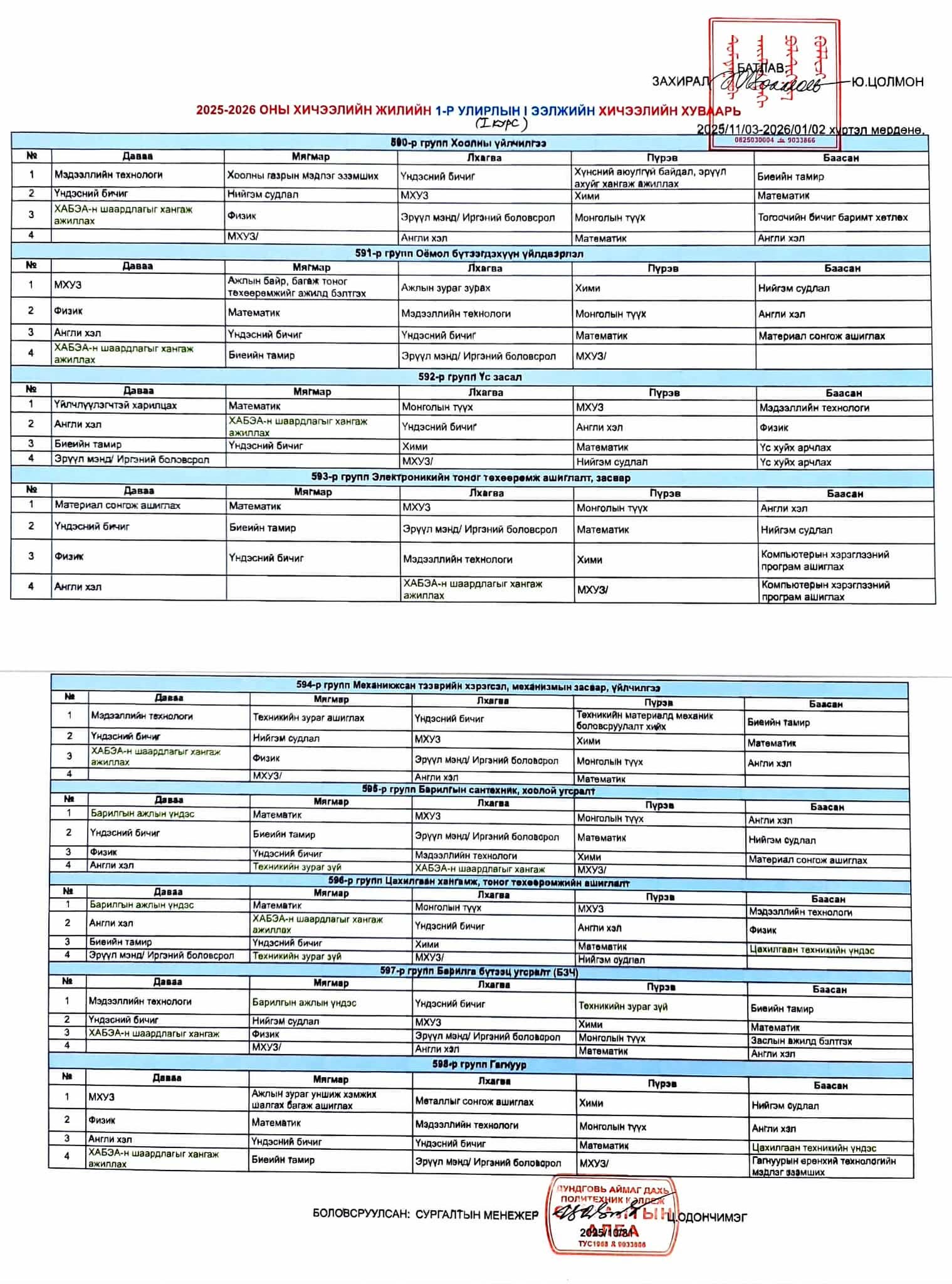 Багш нарын хичээлийн хуваарь