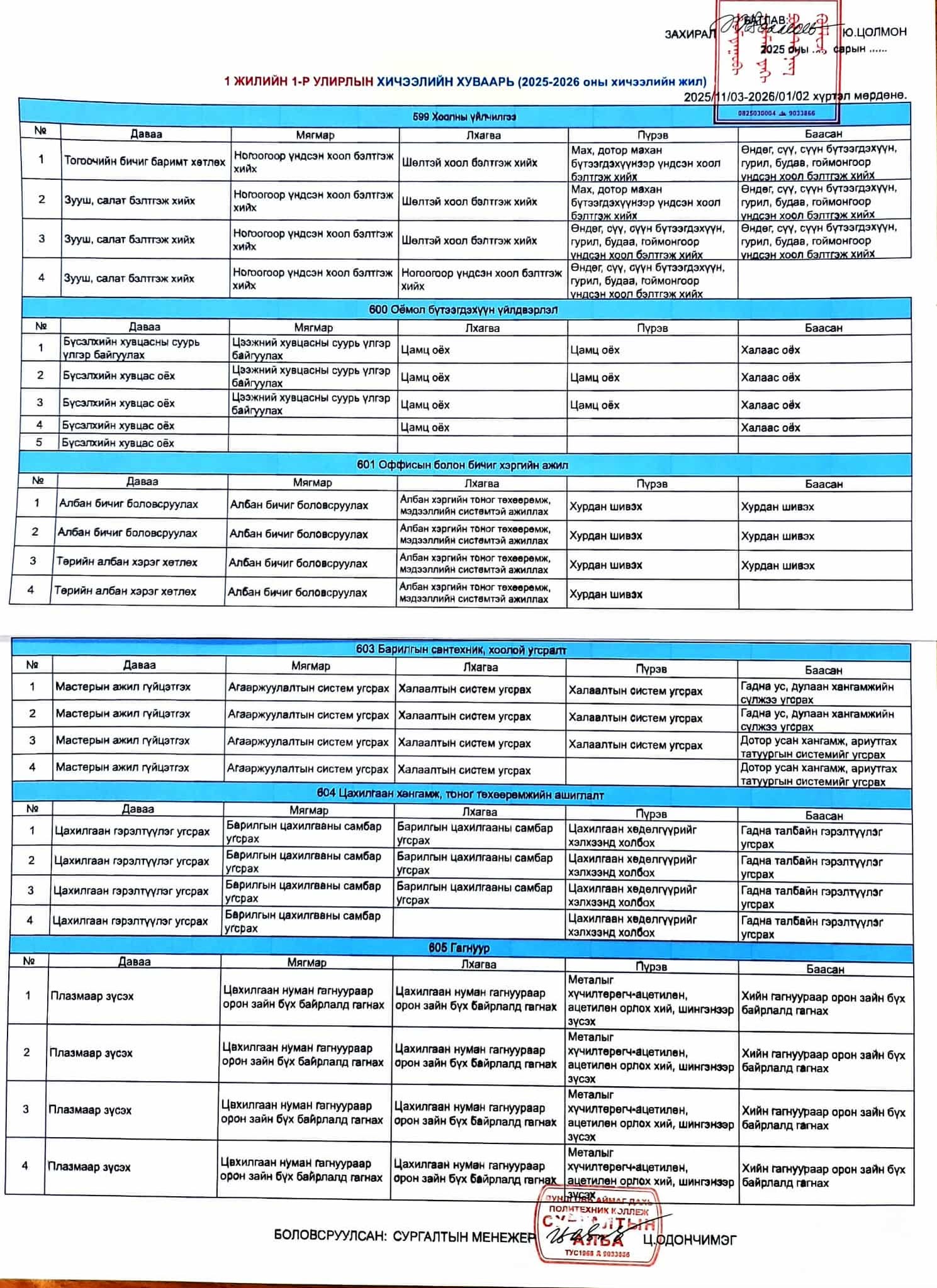 1 жилийн ангийн хуваарь