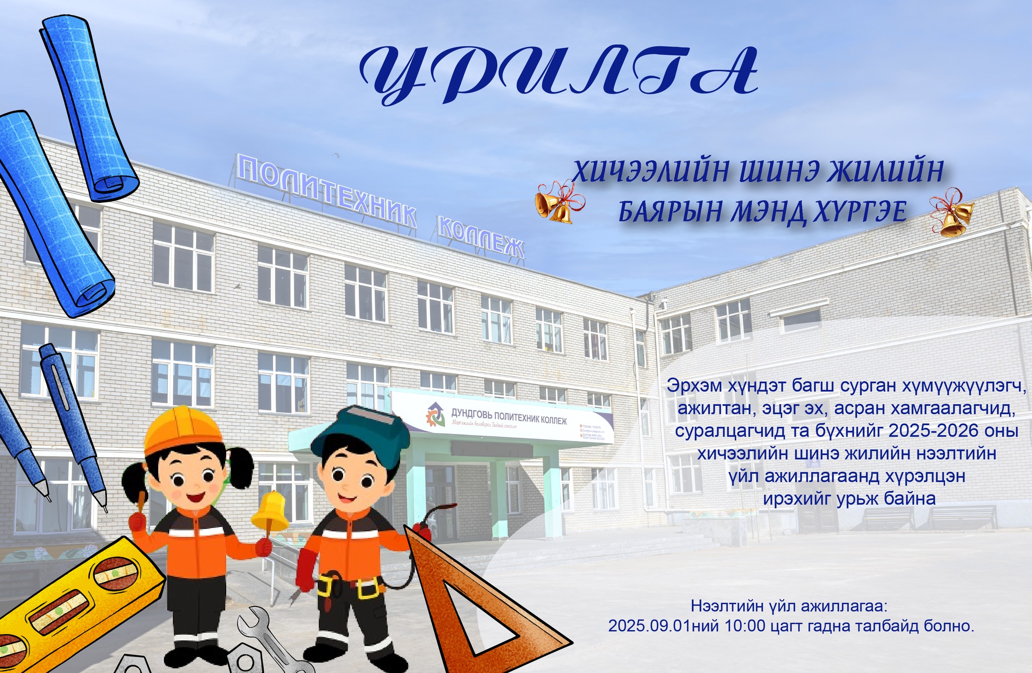 ҮЕ ҮЕИЙН ЭРДЭМТЭН БАГШ, АЖИЛТАН, СУРАЛЧАГЧИД, ЭЦЭГ, ЭХ АСРАН ХАМГААЛАГЧ ТА БҮХНИЙГ 2025-2026 ОНЫ ХИЧЭЭЛИЙН ШИНЭ ЖИЛИЙН НЭЭЛТИЙН ҮЙЛ АЖИЛЛАГААНД ХҮРЭЛЦЭН ИРЭХИЙГ УРЬЖ БАЙНА.